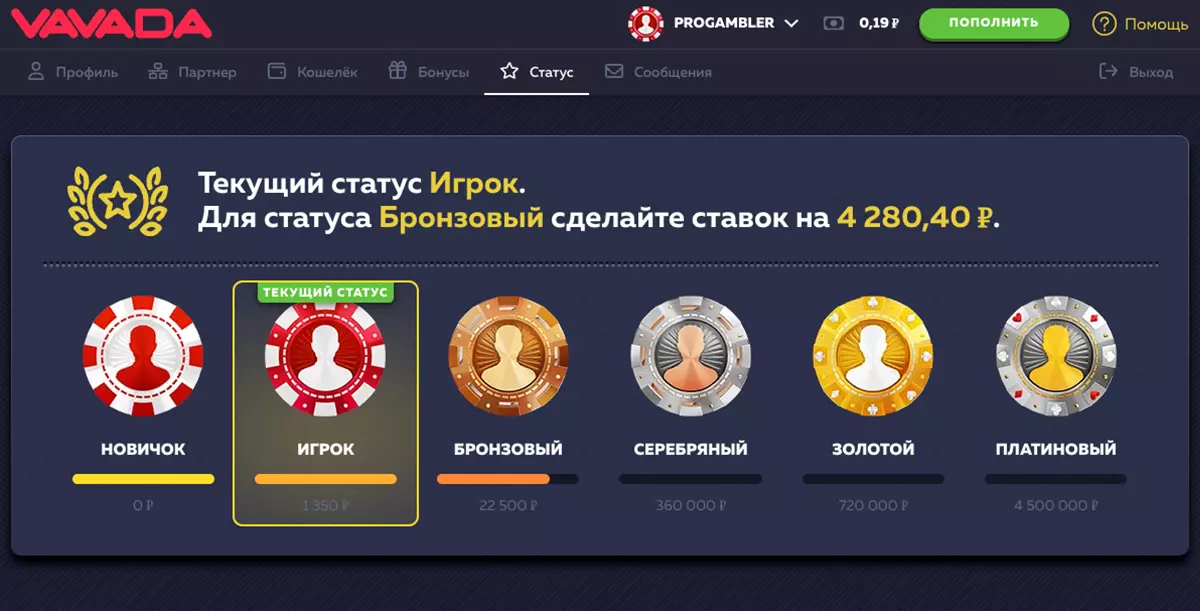 Продвижение по статусам в казино Вавада – это просто и понятно: чем больше вы ставите, тем выше ваш статус. Начиная с Новичка и до Платинового, каждый статус открывает перед вами все новые и новые преимущества. Вот как это работает: